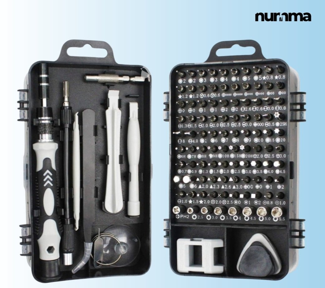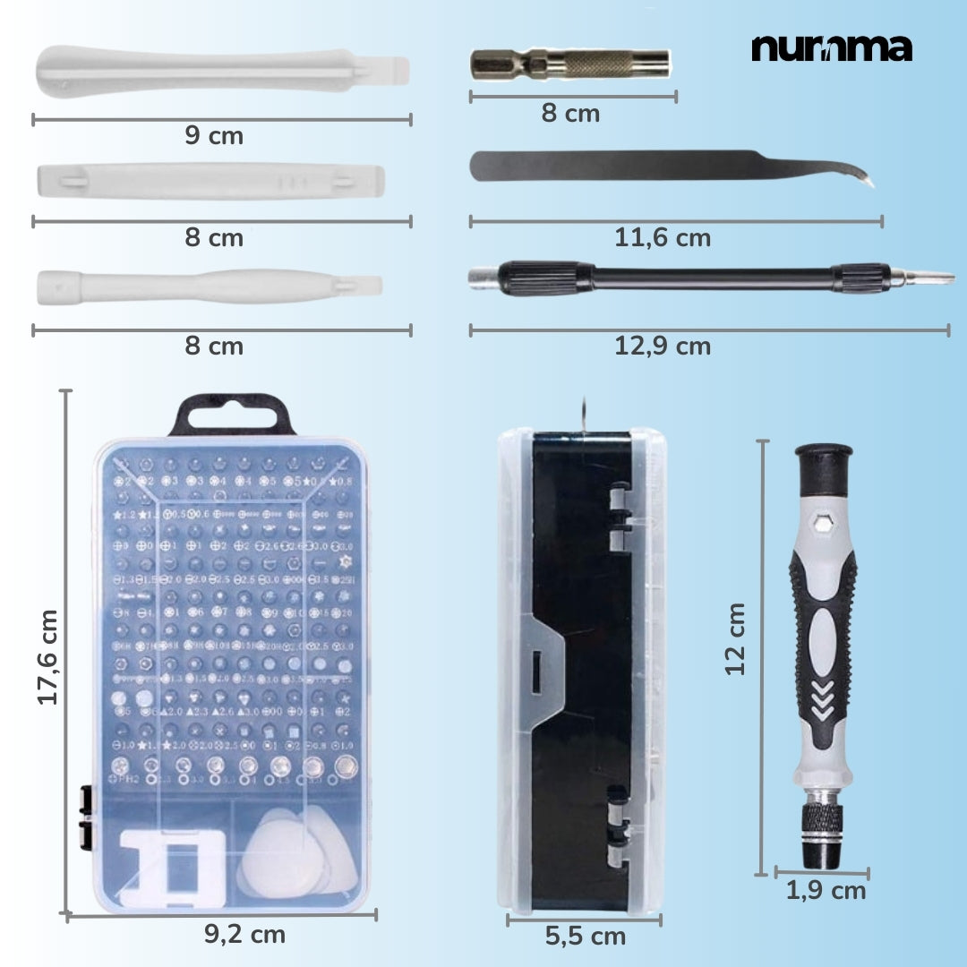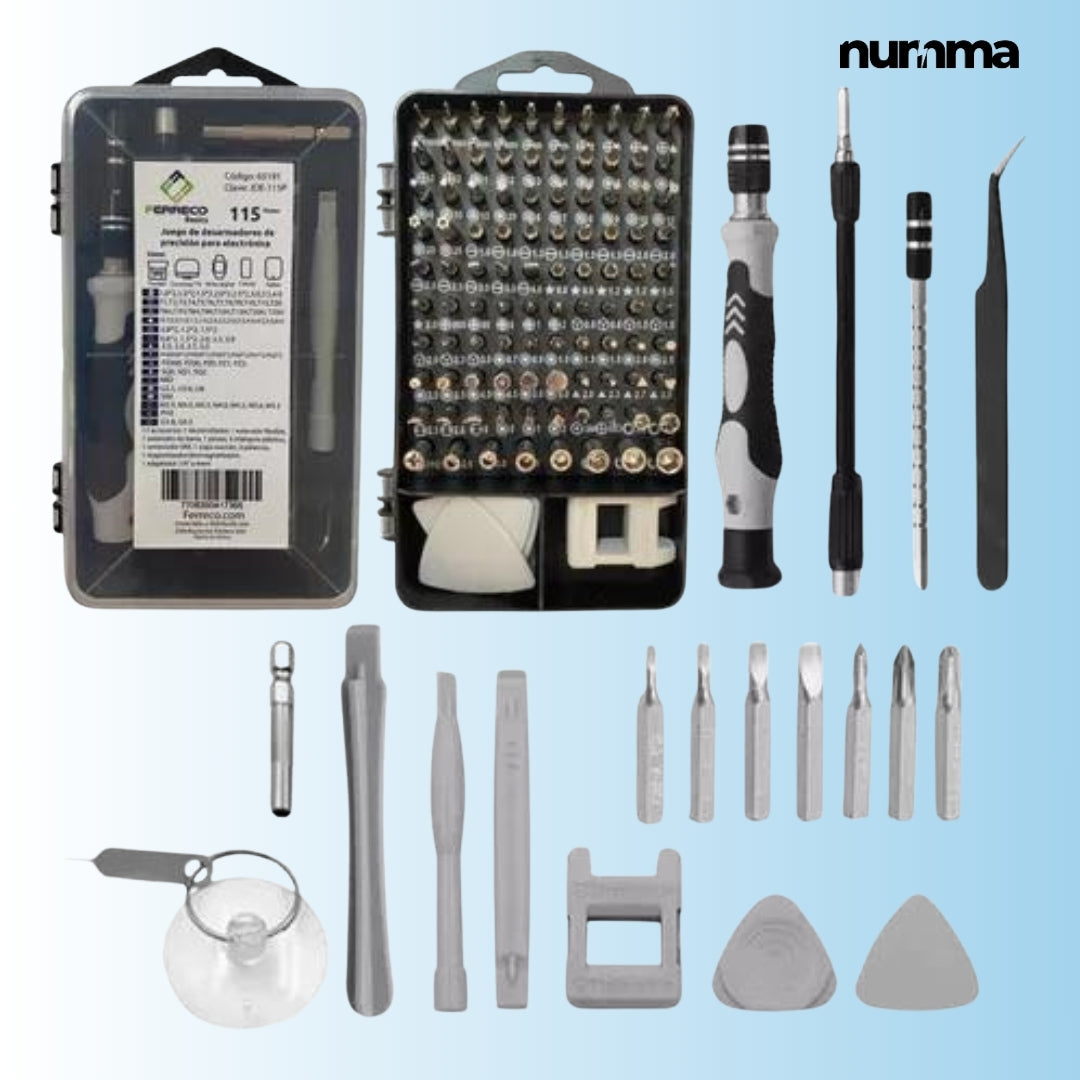 ¡Repara como un profesional con este kit todo en uno! Con 115 herramientas esenciales, materiales de alta calidad y accesorios como un disco magnético y extensiones flexibles, es ideal para arreglar cualquier dispositivo electrónico. Compacto, duradero y fácil de usar, es perfecto para manitas y expertos. ¡Tu mejor aliado en el bricolaje!