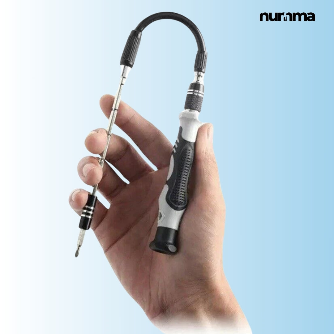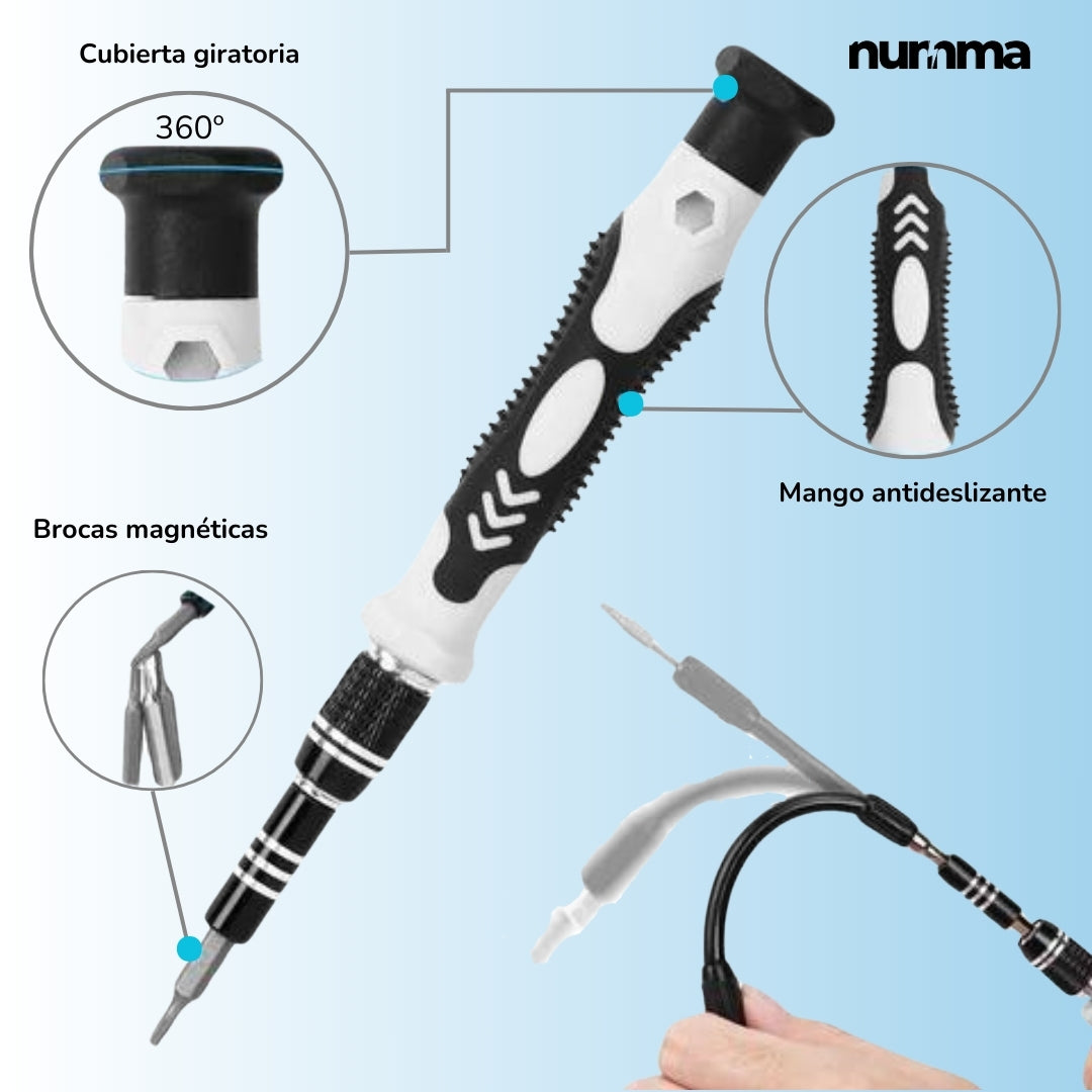 Incluye destornilladores que tienen extensiones flexibles y rígidas, perfectas para llegar a esos lugares complicados. También trae pinzas antiestáticas y mangos de silicona antideslizantes para que tengas un agarre firme y trabajes de manera segura y precisa en todo momento.
