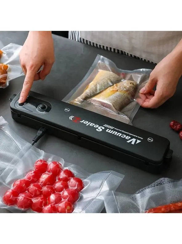 PASO 3: Presiona el botón de sellado y espera 10 segundos mientras la envasadora extrae el aire del interior de la bolsa y lo sella herméticamente.